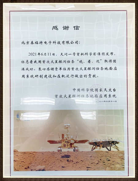 2021年6月11日,天問(wèn)一號(hào)首批科學(xué)影像圖發(fā)布,標(biāo)志著我國(guó)***火星探測(cè)任務(wù)“繞、著、巡”取得圓滿(mǎn)成功。衷心感謝貴單位為***火星探測(cè)任務(wù)地面應(yīng)用系統(tǒng)研制建設(shè)和在軌運(yùn)行做出的貢獻(xiàn)!