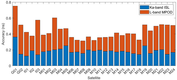 研究結果顯示,北斗三號單向星間鏈路的測距精度可達7厘米,經過全面的誤差修正后,所有衛(wèi)星之間的時間同步精度可以穩(wěn)定在0.4納秒以內。值得注意的是,通過本文方法與目前主流的多星高精度定軌(MPOD)方法對比,北斗三號星間鏈路系統(tǒng)的時間同步精度優(yōu)于MPOD方法(見圖2),展現(xiàn)出顯著的優(yōu)勢。該成果驗證了相關技術在高精度時間同步應用中的卓越性能。