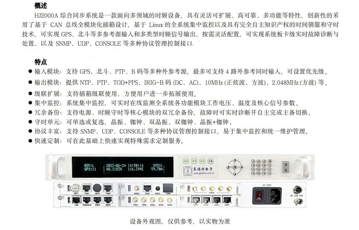 HJ2000A 綜合同步系統是一款面向多領域的時頻設備,具有靈活可擴展、高可靠、多功能等特性,創(chuàng)新性的采用了基于CAN總線全模塊化插箱設計,基于Linux 的全系統集中監(jiān)控以及具有完全自主知識產權的時間馴服和守時技術,可實現 GPS、北斗等多參考源輸入和多類型時頻信號輸出,按需靈活配置,可實現系統板卡級實時故障診斷與處置,以及 SNMP、UDP、CONSOLE 等多種協議管理控制接口,可廣泛應用于...